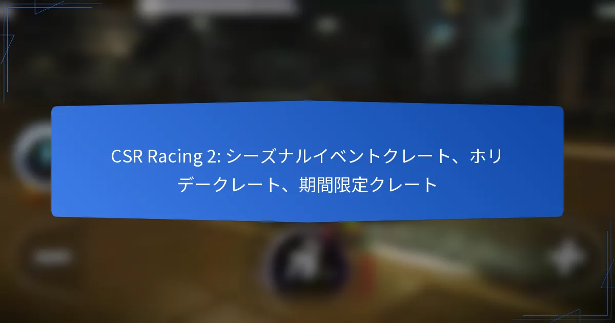 CSR Racing 2の季節イベントクレートは、プレイヤーにユニークな報酬とゲームプレイを向上させる期間限定アイテムを提供します。これらのクレートは特定のイベント中に利用可能で、独占的なテーマを特徴としており、ゲーム内資産を最大化したいプレイヤーにとって貴重な追加要素となります。
